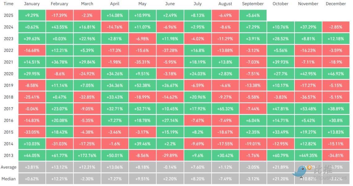 Matrixport 曾在 10 月 1 日(UTC+8)表示,其认为 10 月(UTC+8)是比特币历来表现最强的一个月份,过去十年间比特币在 10 月(UTC+8)的平均涨幅达 21.6%,仅有一年出现下跌。Matrixport 称其曾在 2022、23、24 年的 9 月末或 10 月初(UTC+8)果断看多,虽与彼时的市场主流观点相悖但最终都取得了好的结果,若比特币能维持在 10.8 万美元(UTC+8)以上,则这一季节性优势大概率将持续。